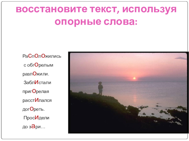 восстановите текст, используя опорные слова:Расположились   с обгорелым разложили.  Заблистали  пригорелая расстилался  догореть.