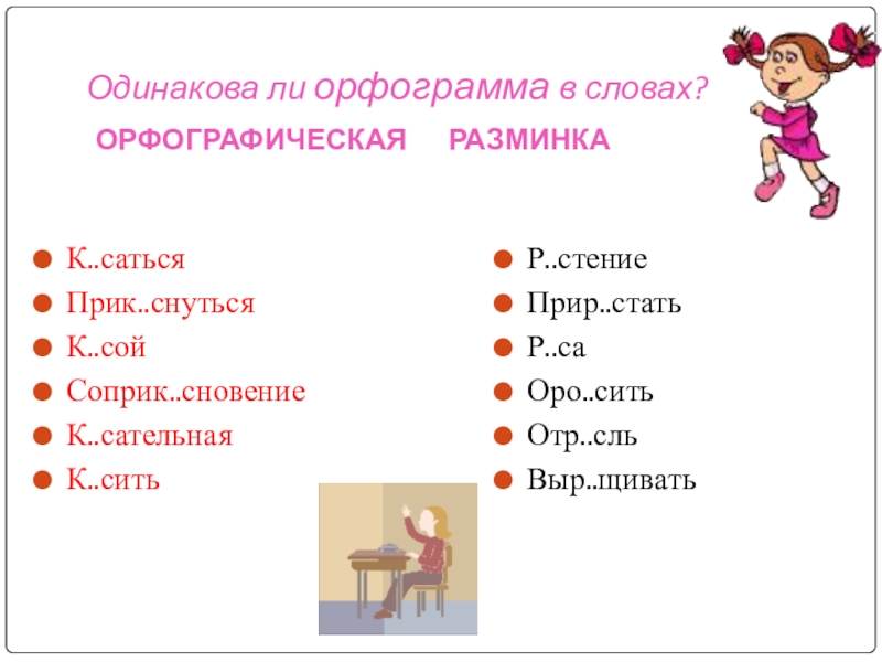 Одинакова ли орфограмма в словах?К..сатьсяПрик..снутьсяК..сойСоприк..сновениеК..сательнаяК..ситьР..стение Прир..статьР..саОро..ситьОтр..сльВыр..щиватьОРФОГРАФИЧЕСКАЯ   РАЗМИНКА