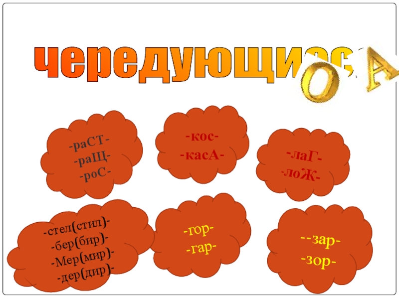 чередующиеся -раСТ- -раЩ- -роС--кос- -касА--лаГ- -лоЖ--гор- -гар---зар- -зор--стел(стил)- -бер(бир)- -Мер(мир)- -дер(дир)-