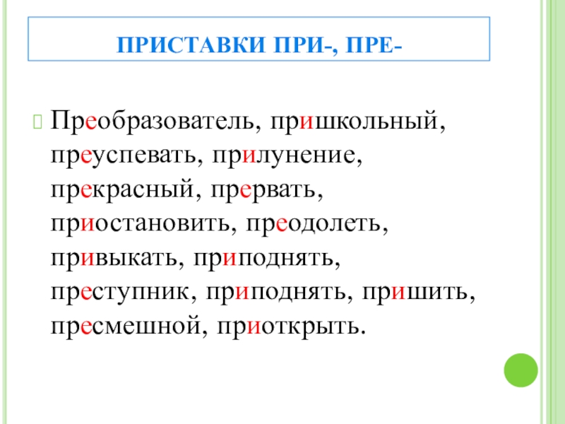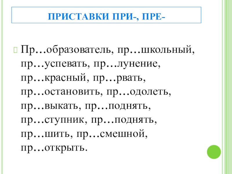 ПРИСТАВКИ ПРИ-, ПРЕ-Преобразователь, пришкольный, преуспевать, прилунение, прекрасный, прервать, приостановить, преодолеть, привыкать, приподнять, преступник, приподнять, пришить, пресмешной, приоткрыть.
