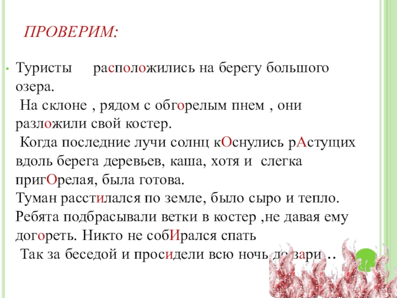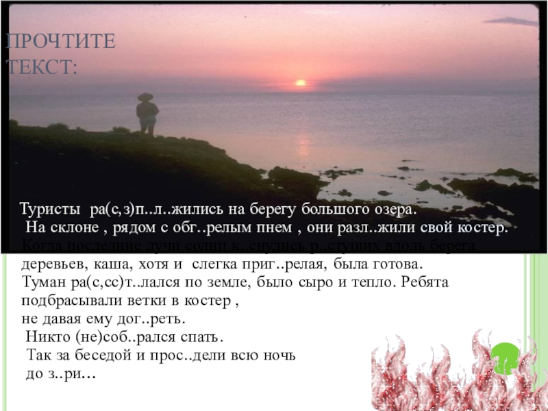 ПРОЧТИТЕ ТЕКСТ:  Туристы ра(с,з)п..л..жились на берегу большого озера.  На склоне , рядом с обг..релым пнем