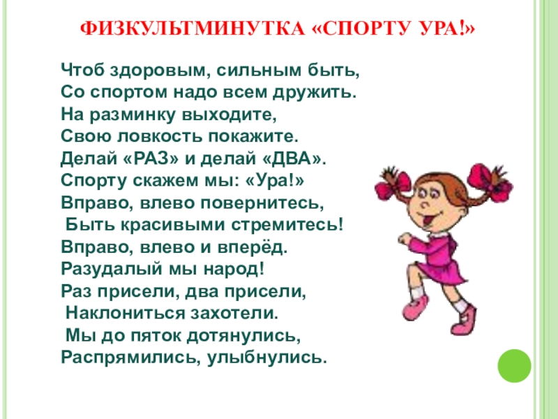ФИЗКУЛЬТМИНУТКА «СПОРТУ УРА!»Чтоб здоровым, сильным быть,Со спортом надо всем дружить.На разминку выходите,Свою ловкость покажите.Делай «РАЗ» и делай