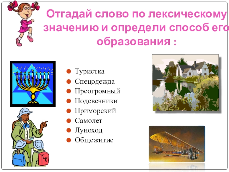 Отгадай слово по лексическому значению и определи способ его образования :ТуристкаСпецодеждаПреогромныйПодсвечникиПриморскийСамолетЛуноходОбщежитие