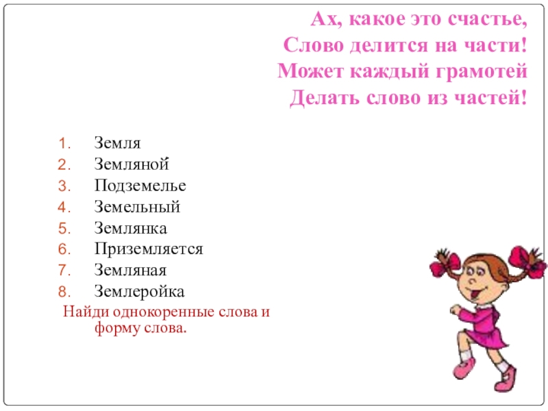 ЗемляЗемлянойПодземельеЗемельныйЗемлянкаПриземляетсяЗемлянаяЗемлеройкаНайди однокоренные слова и форму слова.Ах, какое это счастье, Слово делится на части! Может каждый грамотей Делать слово из частей!