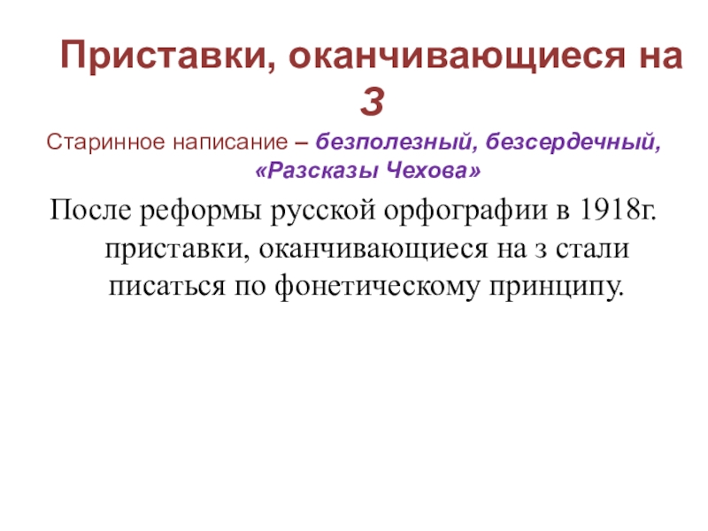 русской орфографии в 1918г. приставки, оканчивающиеся на з стали писаться по фонетическому принципу.