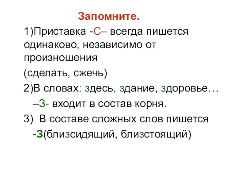 1)Приставка -С– всегда пишется одинаково, независимо от произношения