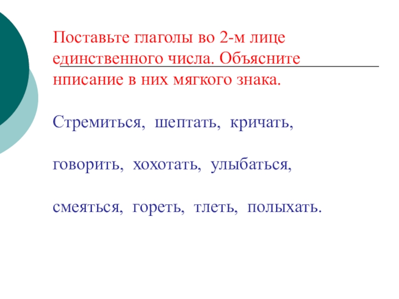 Слайд 9Поставьте глаголы во 2-м лице единственного числа. Объясните нписание в них