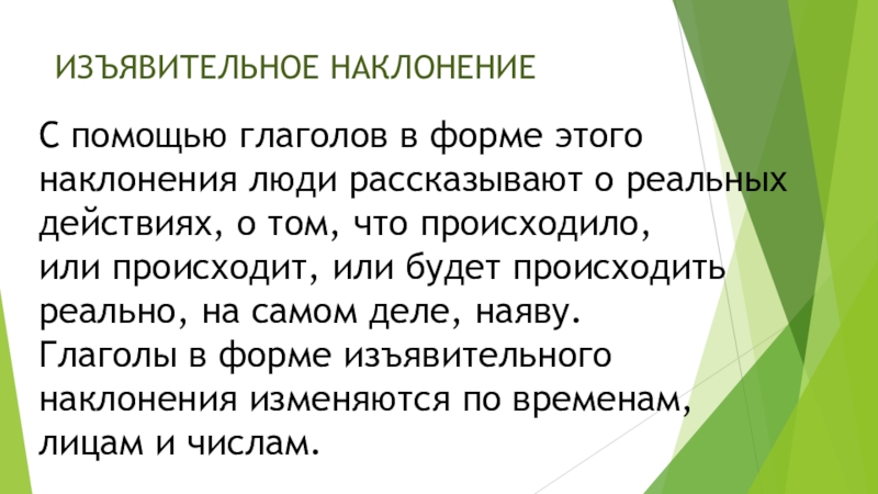 ИЗЪЯВИТЕЛЬНОЕ НАКЛОНЕНИЕС помощью глаголов в форме этого наклонения люди рассказывают о реальныхдействиях, о том, что происходило, или