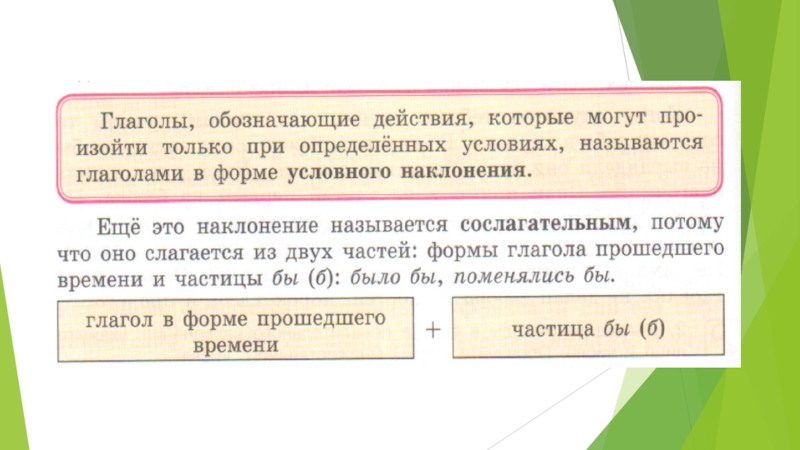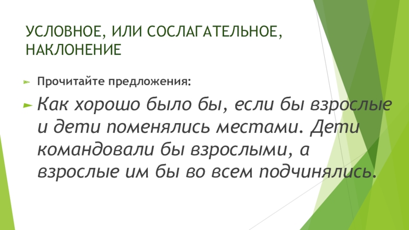 УСЛОВНОЕ, ИЛИ СОСЛАГАТЕЛЬНОЕ, НАКЛОНЕНИЕПрочитайте предложения:Как хорошо было бы, если бы взрослые и дети поменялись местами. Дети командовали