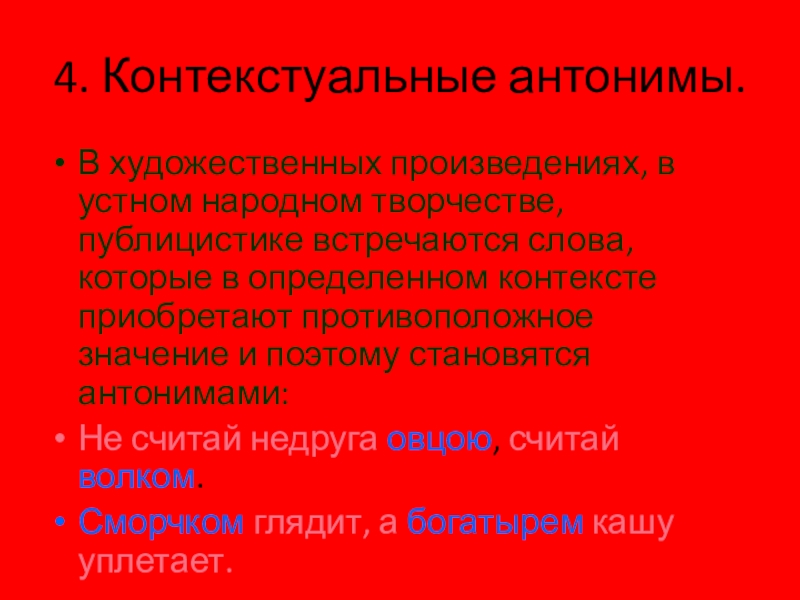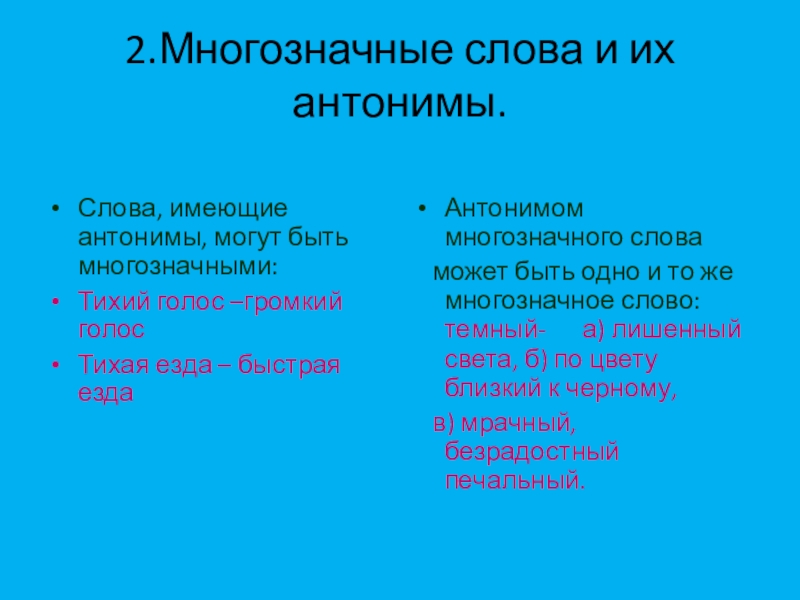 может быть одно и то же многозначное слово: темный- а) лишенный света, б) по цвету близкий к черному,