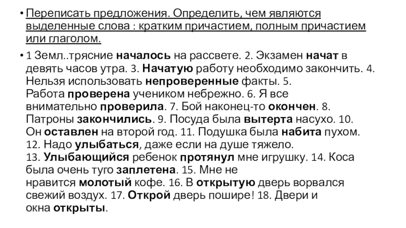 1 Земл..трясние началось на рассвете. 2. Экзамен начат в девять часов утра. 3. Начатую работу необходимо закончить. 4. Нельзя использовать непроверенные факты. 5. Работа проверена учеником небрежно. 6. Я все внимательно проверила. 7. Бой наконец-то окончен. 8. Патроны закончились. 9. Посуда была вытерта насухо. 10. Он оставлен на второй год. 11. Подушка была набита пухом. 12. Надо улыбаться, даже если на душе тяжело. 13. Улыбающийся ребенок протянул мне игрушку. 14. Коса была очень туго заплетена. 15. Мне не нравится молотый кофе. 16. В открытую дверь ворвался свежий воздух. 17. Открой дверь пошире! 18. Двери и окна открыты.
