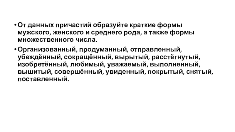 Слайд 11От данных причастий образуйте краткие формы мужского, женского и среднего рода,