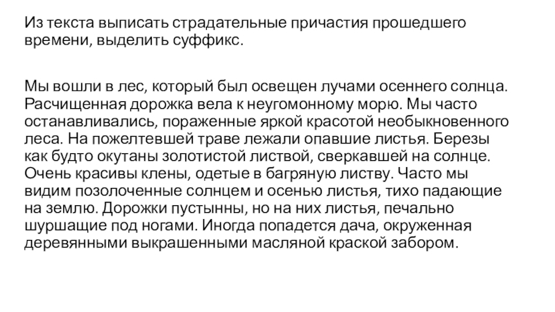 Слайд 4Из текста выписать страдательные причастия прошедшего времени, выделить суффикс.