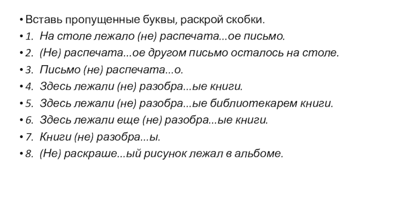 5. Здесь лежали (не) разобра...ые библиотекарем книги.