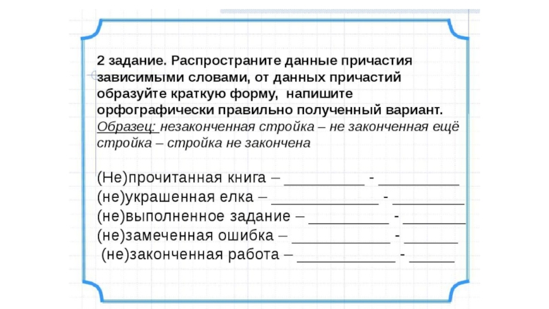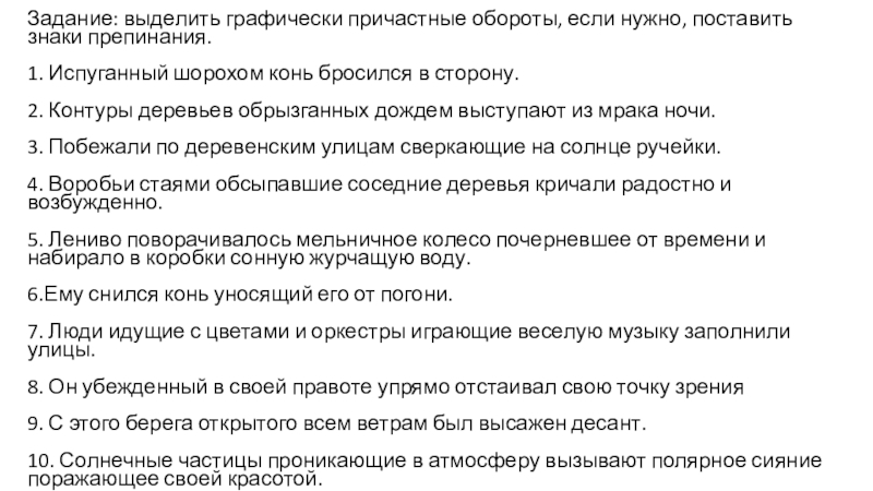 Слайд 13Задание: выделить графически причастные обороты, если нужно, поставить знаки препинания.