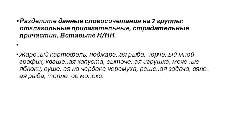Жаре..ый картофель, поджаре..ая рыба, черче..ый мной график, кваше..ая капуста, выточе..ая игрушка, моче..ые яблоки, суше..ая на чердаке черемуха, реше..ая задача, вяле..ая рыба, топле..ое молоко.
