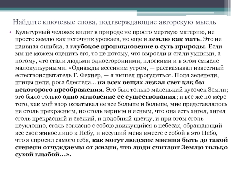 Слайд 13Найдите ключевые слова, подтверждающие авторскую мысль