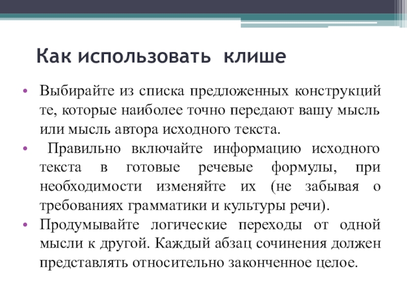 Правильно включайте информацию исходного текста в готовые речевые формулы, при необходимости изменяйте их (не забывая о требованиях грамматики и культуры речи).