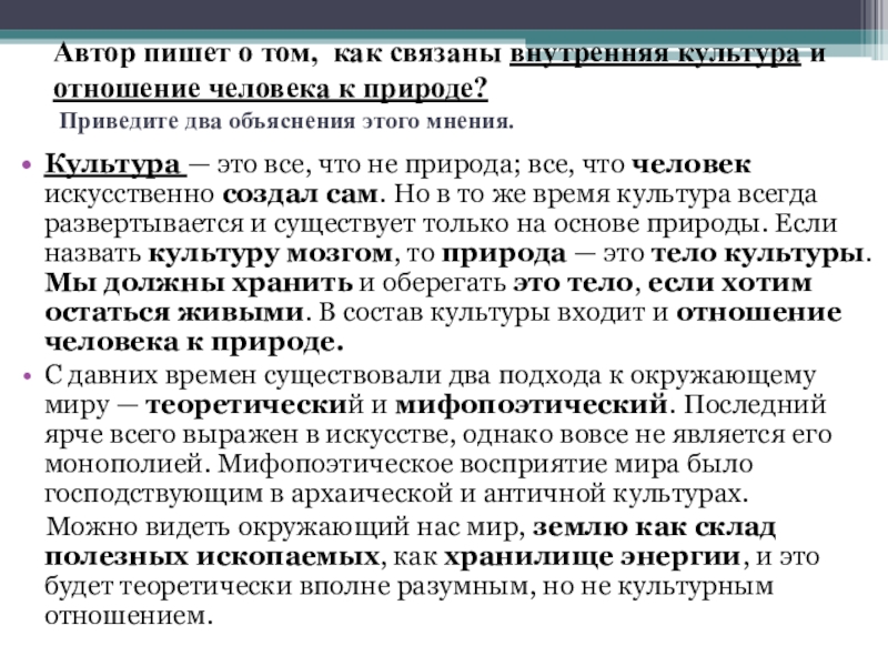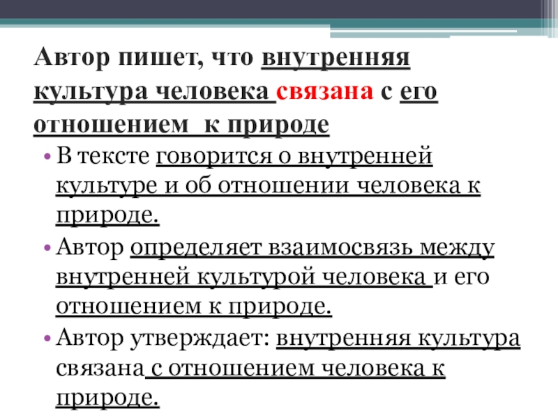 Слайд 8Автор пишет, что внутренняя культура человека связана с его отношением к