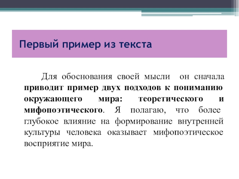 он сначала приводит пример двух подходов к пониманию окружающего мира: теоретического и мифопоэтического. Я полагаю, что более глубокое влияние на формирование внутренней культуры человека оказывает мифопоэтическое восприятие мира.