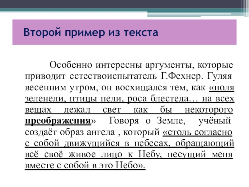 Особенно интересны аргументы, которые приводит естествоиспытатель Г.Фехнер. Гуляя весенним утром, он восхищался тем, как «поля зеленели, птицы пели, роса блестела… на всех вещах лежал свет как бы некоторого преображения» Говоря о Земле, учёный создаёт образ ангела , который «столь согласно с собой движущийся в небесах, обращающий всё своё живое лицо к Небу, несущий меня вместе с собой в это Небо».