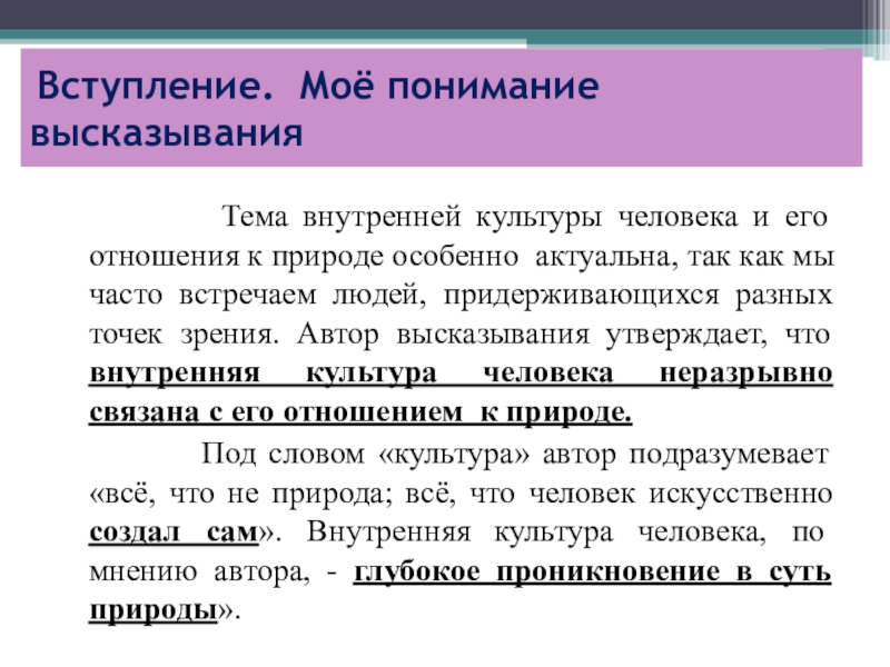 Тема внутренней культуры человека и его отношения к природе особенно актуальна, так как мы часто встречаем людей, придерживающихся разных точек зрения. Автор высказывания утверждает, что внутренняя культура человека неразрывно связана с его отношением к природе.