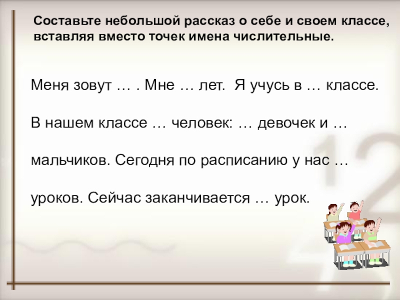 Меня зовут … . Мне … лет. Я учусь в … классе.