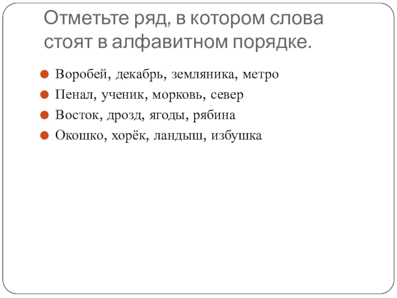 Слайд 7Отметьте ряд, в котором слова стоят в алфавитном порядке.