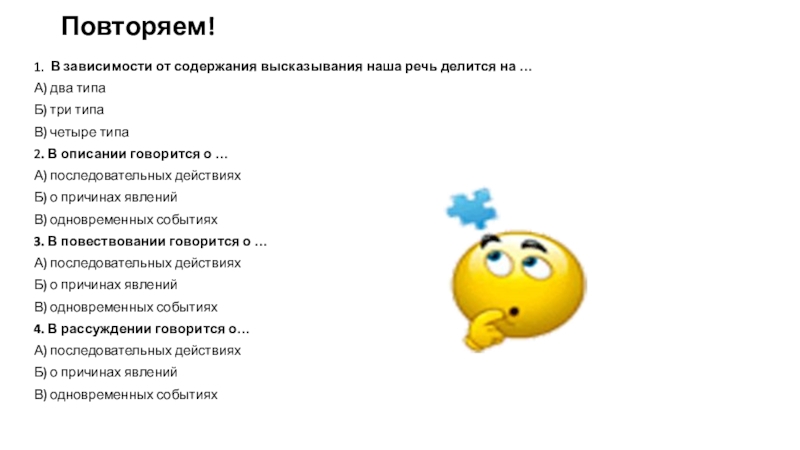 Повторяем!1. В зависимости от содержания высказывания наша речь делится на …А) два типаБ) три типаВ) четыре типа