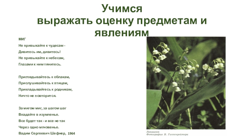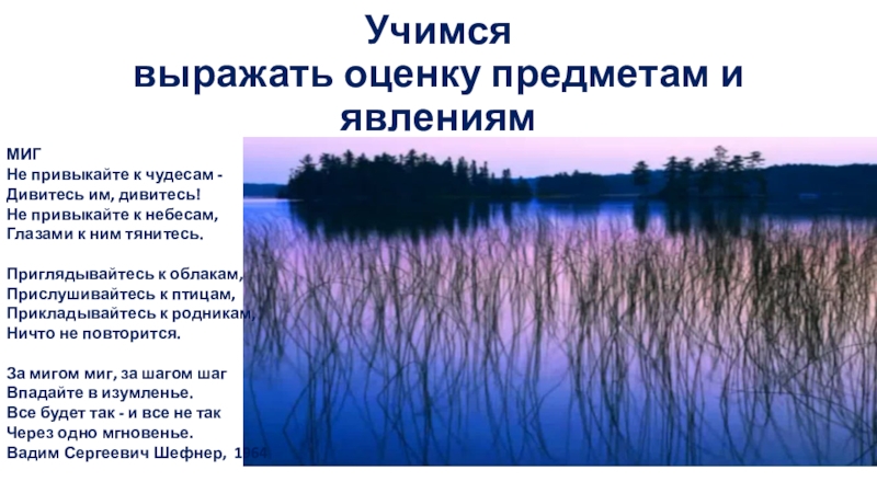 Учимся  выражать оценку предметам и явлениямМИГНе привыкайте к чудесам -Дивитесь им, дивитесь!Не привыкайте к небесам,Глазами к