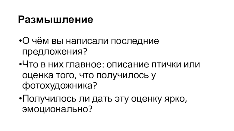 РазмышлениеО чём вы написали последние предложения?Что в них главное: описание птички или оценка того, что получилось у