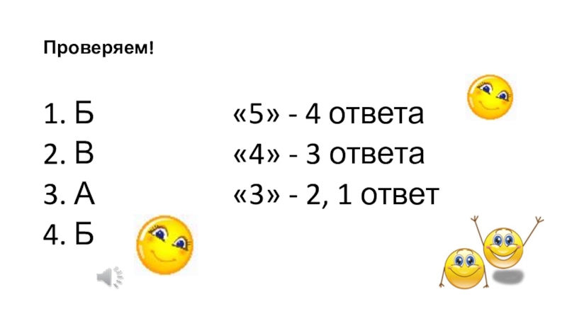 Проверяем!1. Б          «5» - 4 ответа2. В