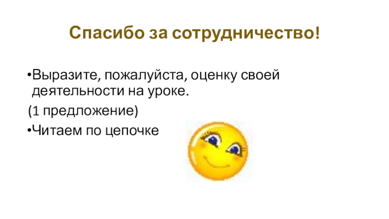 Спасибо за сотрудничество!Выразите, пожалуйста, оценку своей деятельности на уроке. (1 предложение)Читаем по цепочке