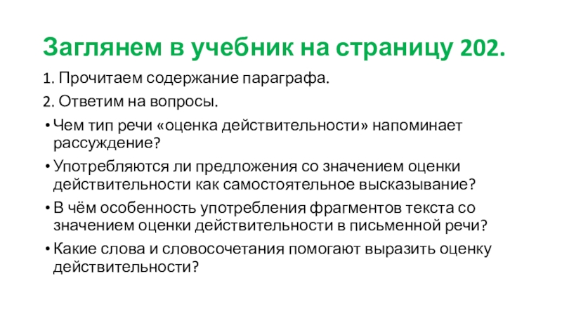 Заглянем в учебник на страницу 202.1. Прочитаем содержание параграфа.2. Ответим на вопросы.Чем тип речи «оценка действительности» напоминает