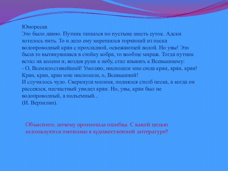 Объясните, почему произошла ошибка. С какой целью используются омонимы в художественной литературе?