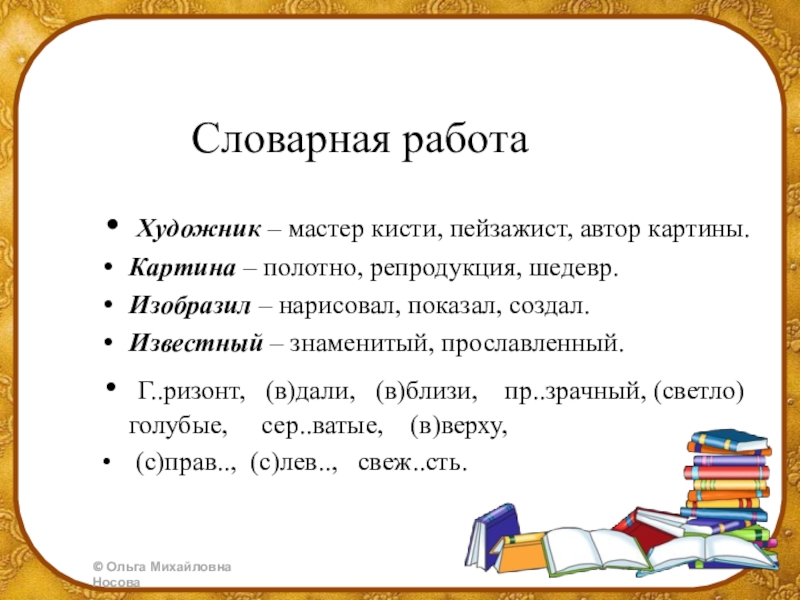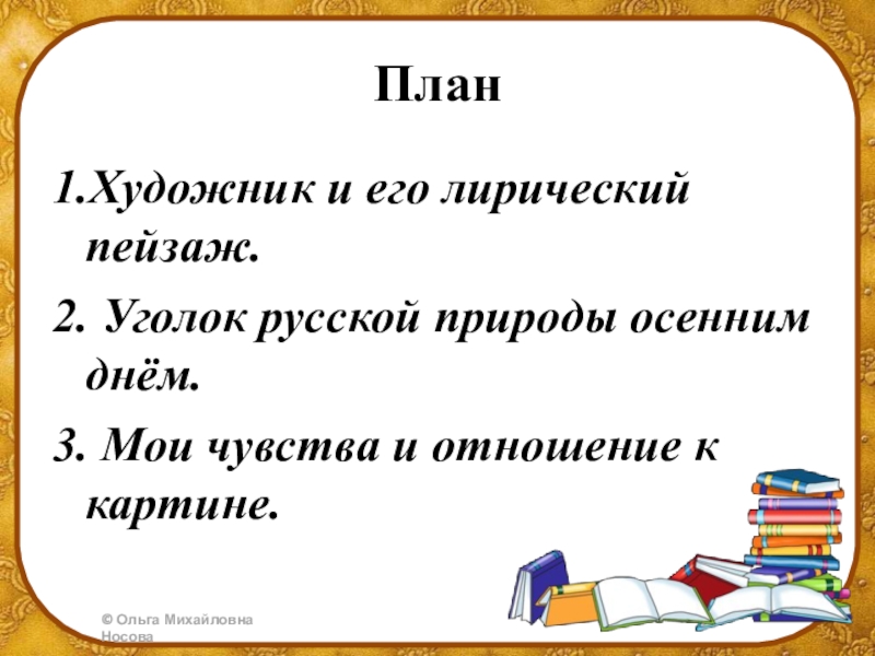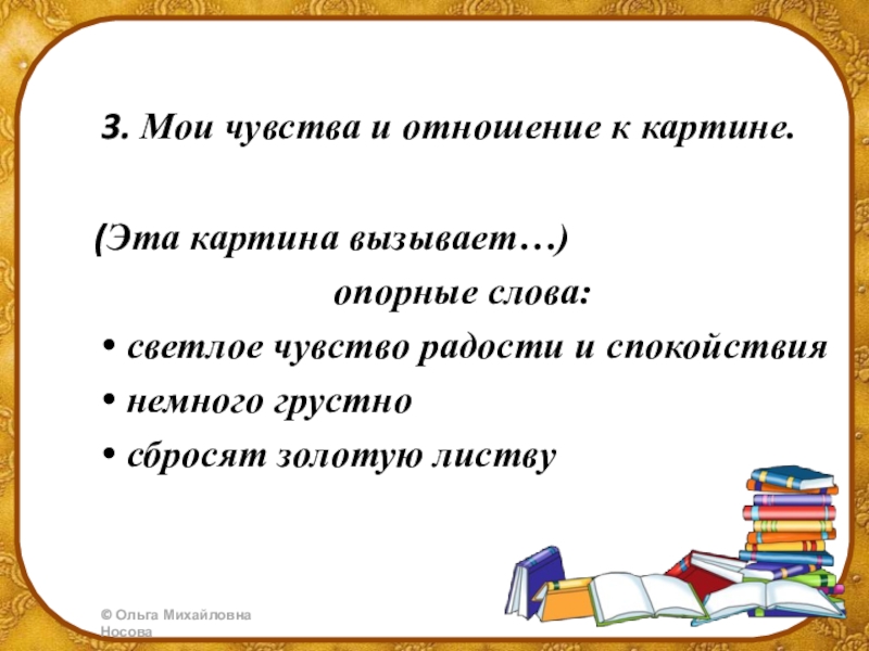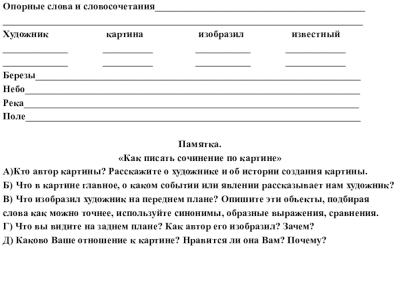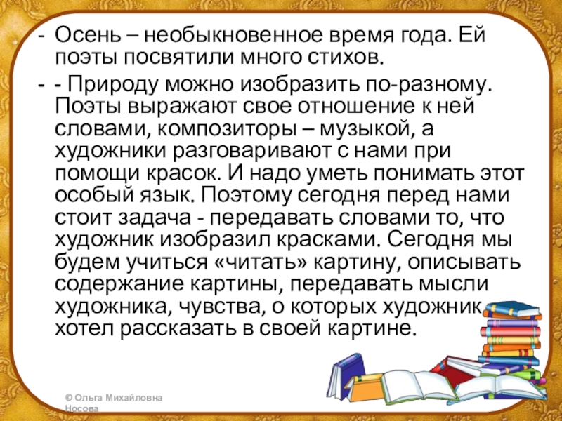 изобразить по-разному. Поэты выражают свое отношение к ней словами, композиторы – музыкой, а художники разговаривают с нами при помощи красок. И надо уметь понимать этот особый язык. Поэтому сегодня перед нами стоит задача - передавать словами то, что художник изобразил красками. Сегодня мы будем учиться «читать» картину, описывать содержание картины, передавать мысли художника, чувства, о которых художник хотел рассказать в своей картине.