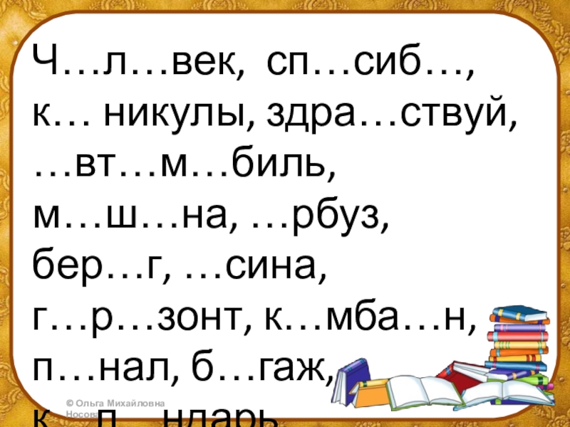 Слайд 3Ч…л…век, сп…сиб…, к… никулы, здра…ствуй, …вт…м…биль, м…ш…на, …рбуз, бер…г, …сина, г…р…зонт,