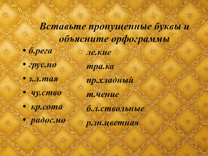 Слайд 15Вставьте пропущенные буквы и объясните орфограммы