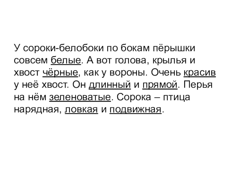 вот голова, крылья и хвост ………, как у вороны. Очень …….. у неё хвост. Он …….. и ……… . Перья на нём ……….. . Сорока – птица нарядная, ……… и ……….. .