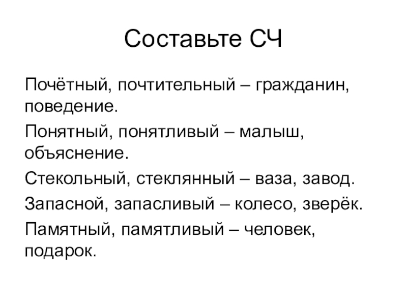 Составьте СЧПочётный, почтительный – гражданин, поведение.Понятный, понятливый – малыш, объяснение.Стекольный, стеклянный – ваза, завод.Запасной, запасливый – колесо,