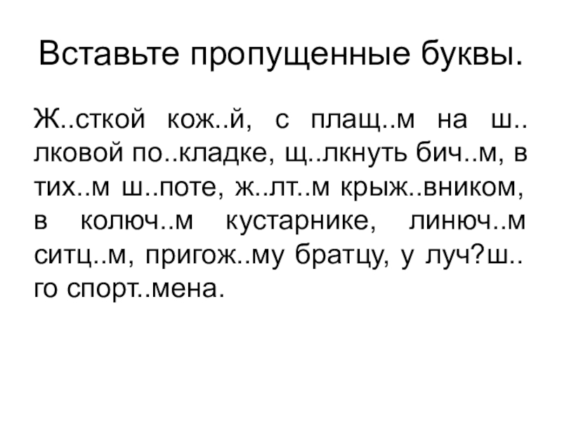 Вставьте пропущенные буквы.Ж..сткой кож..й, с плащ..м на ш..лковой по..кладке, щ..лкнуть бич..м, в тих..м ш..поте, ж..лт..м крыж..вником, в