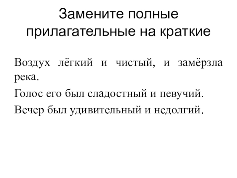 Замените полные прилагательные на краткиеВоздух лёгкий и чистый, и замёрзла река.Голос его был сладостный и певучий.Вечер был
