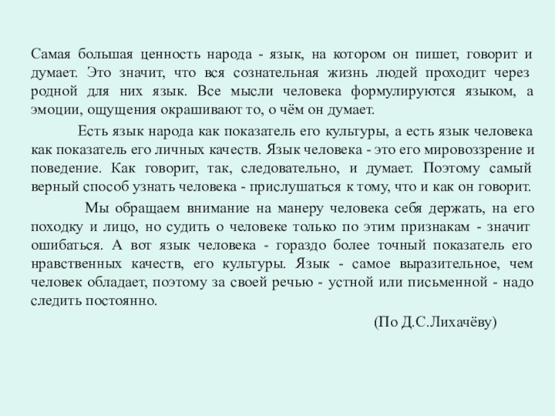 Мы обращаем внимание на манеру человека себя держать, на его походку и лицо, но судить о человеке только по этим признакам - значит ошибаться. А вот язык человека - гораздо более точный показатель его нравственных качеств, его культуры. Язык - самое выразительное, чем человек обладает, поэтому за своей речью - устной или письменной - надо следить постоянно.