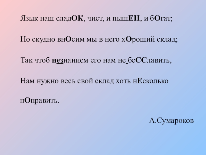 Слайд 1Язык наш сладОК, чист, и пышЕН, и бОгат;