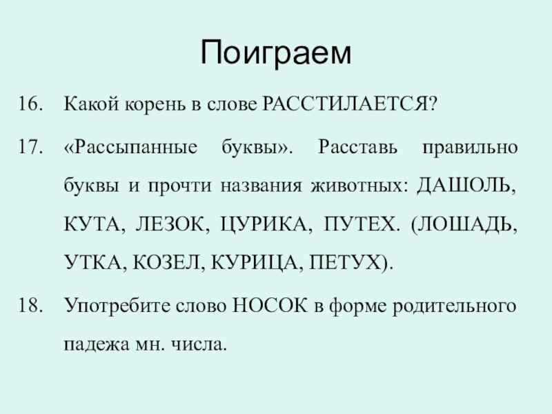 прочти названия животных: ДАШОЛЬ, КУТА, ЛЕЗОК, ЦУРИКА, ПУТЕХ. (ЛОШАДЬ, УТКА, КОЗЕЛ, КУРИЦА, ПЕТУХ).