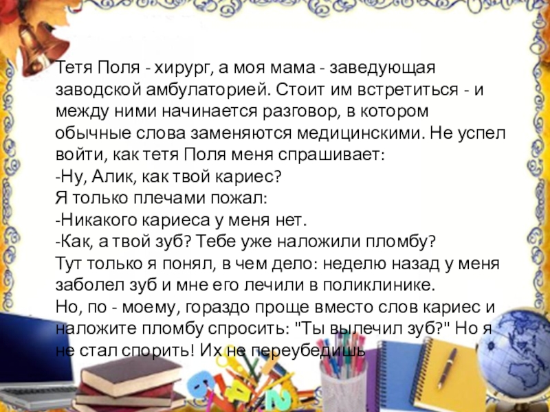 Но, по - моему, гораздо проще вместо слов кариес и наложите пломбу спросить: "Ты вылечил зуб?" Но я не стал спорить! Их не переубедишь