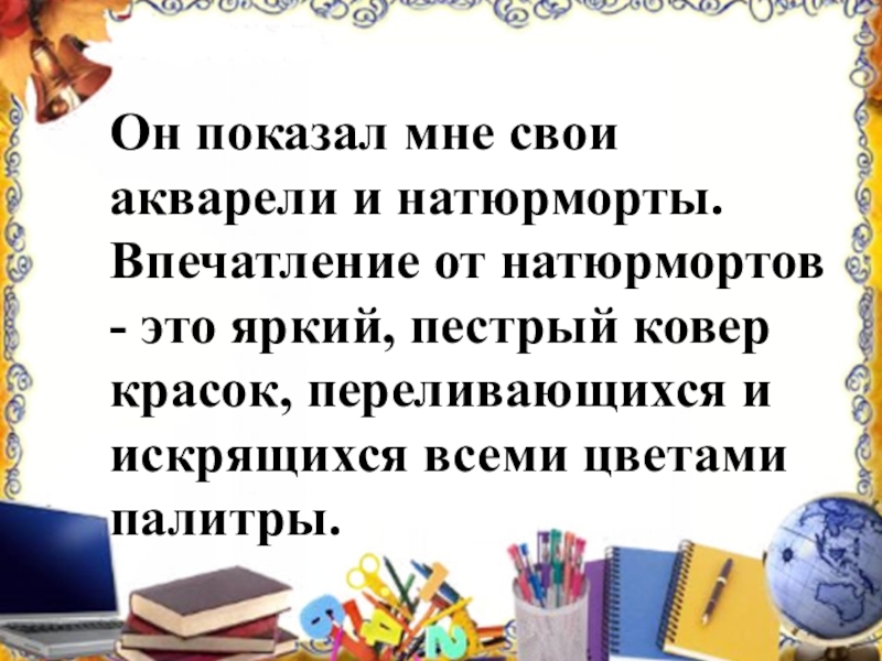 Слайд 3Он показал мне свои акварели и натюрморты. Впечатление от натюрмортов -
