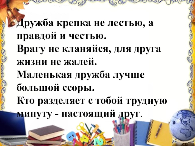 Слайд 2Дружба крепка не лестью, а правдой и честью.
