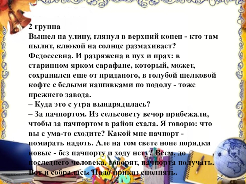 – За пачпортом. Из сельсовету вечор прибежали, чтобы за пачпортом в район ехала. Я говорю: что вы с ума-то сходите? Какой мне пачпорт - помирать надоть. Алe на том свете ноне порядки новые - без пачпорту и ходу нету? Всем, до последнего человека, говорят, пачпорта получать. Вот и собралась. Надо приказ сполнять.