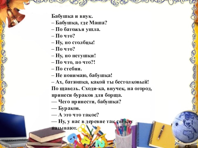 – Ах, батюшка, какой ты бестолковый! По щавель. Сходи-ка, внучек, на огород, принеси бураков для борща.